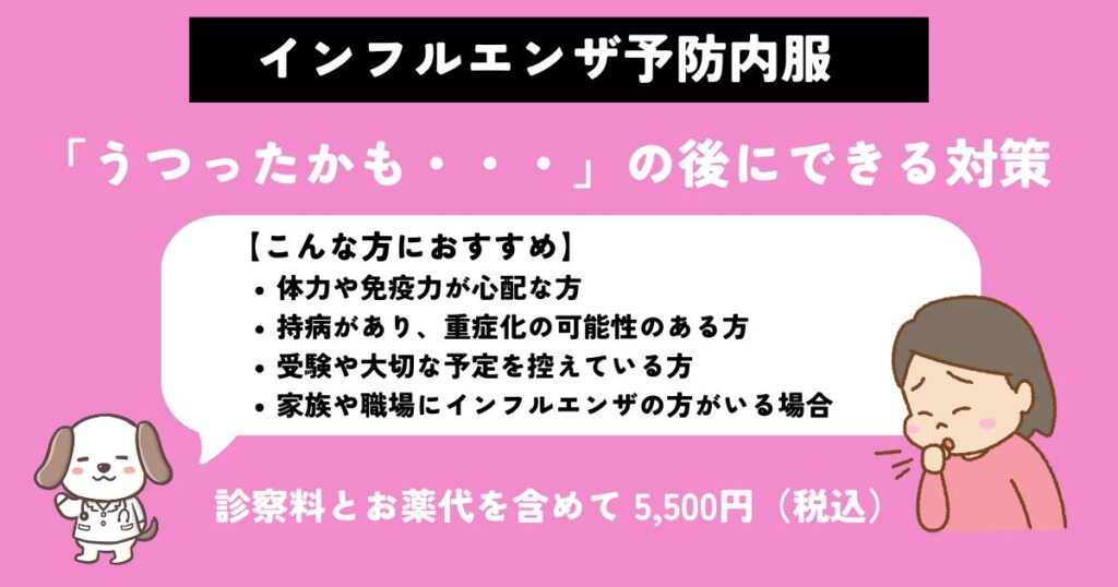 事前にお電話いただくか、ネット予約時のコメント欄に「インフルエンザ予防内服希望」とご記入ください。